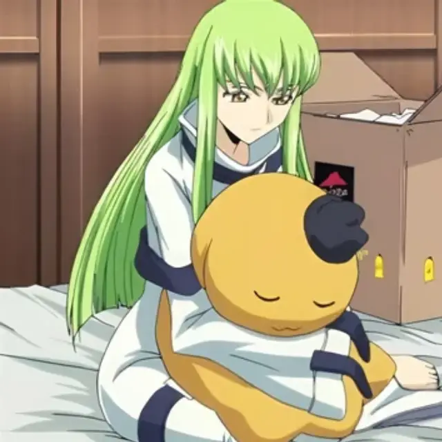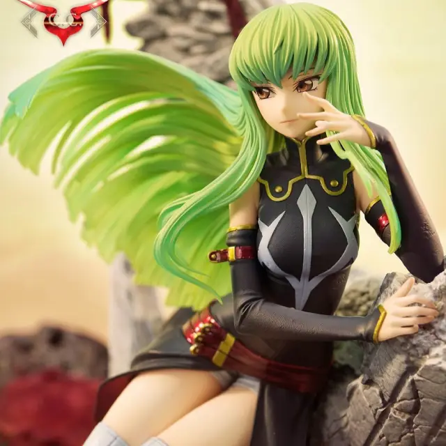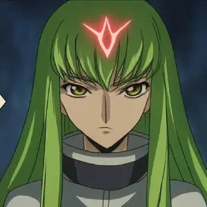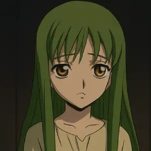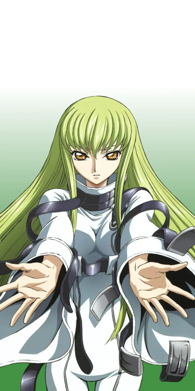 The character is C.C.from the anime "Code GeassLelouch of the Rebellion". She has iconic long green hair and is a key character in the work with the special ability "Geass". She often appears mysterious and calm.